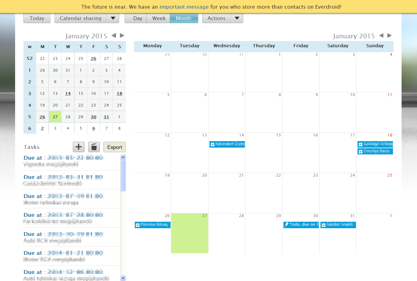Hi, I must say I'm puzzled by the fact apparent difficulty that seems to be associated with this task - frankly, every single task manager I've used lately worked this way, displaying a task/todo on its due date in my calendar (than came Android and plunged me straight back into the dark ages). Unfortunately I can't quote every source I no longer remember, but here's at least one screenshot as a witness of how another browser-based client (Everdroid) does the same thing: the blurred tags are birthday events, I left the single Todo event due on 30th unblurred - it's visibly treated the same as an event that day, even the smaller top-left calendar highlights the 30th just because it has a todo due that day. My previous phone, a Samsung 7110 with Symbian did the exact same thing - it highlighted the day just as if it had an event, and displayed the todo text in a floating tooltip if I selected that day - I can get a screenshot of that too, if you need one (actually, the Samsung went even a step further - it had an "list of upcoming events" on its default screen which included both events and due tasks - but it only started showing them a week before they were due, which was incomparably more helpful than simply showing a full list at all times, even if the first thing is half a year away - I would have to expend effort to realize that). I have to say again, for me this industry standard behavior - I'm sure not all software does this, but the ones I've been using certainly all did... - Attila On 27-Jan-2015 17:15, Ján Máté wrote: