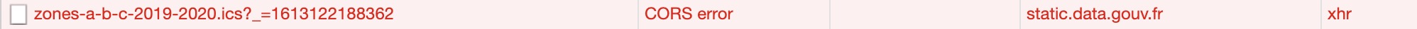Blocage d’une requête multiorigines (Cross-Origin Request) : la politique « Same Origin » ne permet pas de consulter la ressource distante située sur https://static.data.gouv.fr/resources/le-calendrier-scolaire-format-ical/202.... Raison : l’en-tête « x-requested-with » n’est pas autorisé d’après l’en-tête « Access-Control-Allow-Headers » de la réponse de pré-vérification des requêtes CORS.