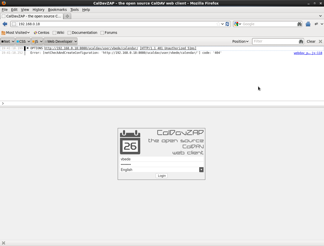Hi Jan, I'm attaching screenshot from webconsole of firefox. It is getting an unauthorised error. Foll is my global network setting line : var globalNetworkCheckSettings={href: ' http://192.168.0.18:8080/ucaldav/user/', hrefLabel: null, crossDomain: null, additionalResources: [], forceReadOnly: n ull, withCredentials: false, showHeader: true, settingsAccount: true, syncInterval: 60000, timeOut: 30000, lockTimeOut: 10000, delegation: false, backgroundC alendars: [], ignoreAlarms: false } My CalDav-Zap version is 0.9.0. Thanks, Amol. On Fri, Jul 26, 2013 at 2:56 PM, Ján Máté <jan.mate@inf-it.com> wrote: