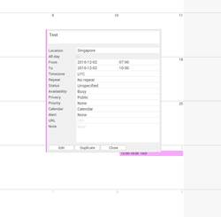 Thank you! Sorry, I missed the AMPM-format in the config.js. Yes, I have set ‘Asia/Singapore’ at the left bottom. Attached, you can see the issue I am talking about: From: Ján Máté [mailto:jan.mate@inf-it.com] Sent: Thursday, 7 January, 2016 21:48 To: davclients@inf-it.com Subject: Re: [Inf-IT DAVcl] Timezone issues Hi, On 07 Jan 2016, at 04:19, MicTieMix <mictiemix@gmail.com <mailto:mictiemix@gmail.com> > wrote: Thank you for providing InfCloud to the community! I have assigned Asia/Singapore as my timezone in config.js, and this is also recognized in month/mweek/week/day-views. But when I hover over the appointment or open an appointment the time is shown un UTC. For example : Appointment start 20:00 SGT is shown as 12:00 UTC, which correct but inconvenient. The appointments a coming from Outlook and ‘synchronized’. Appointments directly entered in InfCloud do not show this issue. Is there a way to show the time using the correct timezone (i.e. 20:00 SGT in above example) ? have you set the timezone (at the left bottom) to Asia/Singapore? Is there a way to show times in 24-hours format? from the config.js: // globalAMPMFormat // This option enables to use 12 hours format (AM/PM) for displaying time. // NOTE: time format is predefined for each localization - use this option // ONLY if you want to use custom time format (instead of the localization // predefined one). // Example: //var globalAMPMFormat=false; Thank you! JM